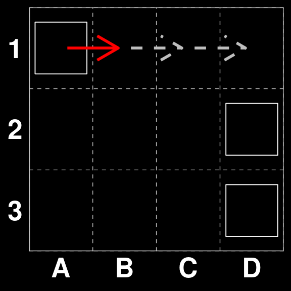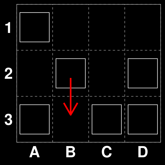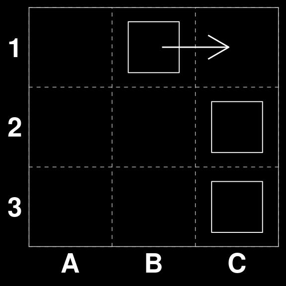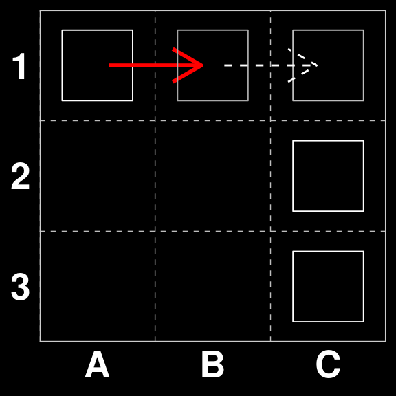 In our original State space $_{259} does not have a directly scoring move, however, the correct move is A1 to B1, in preparatin for B1xC1 on the next round.