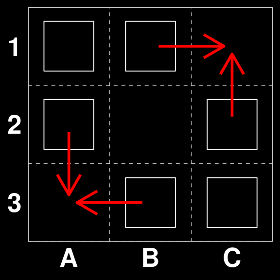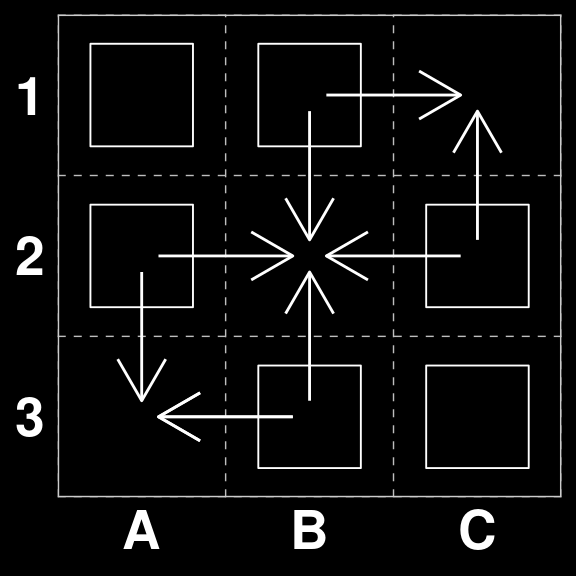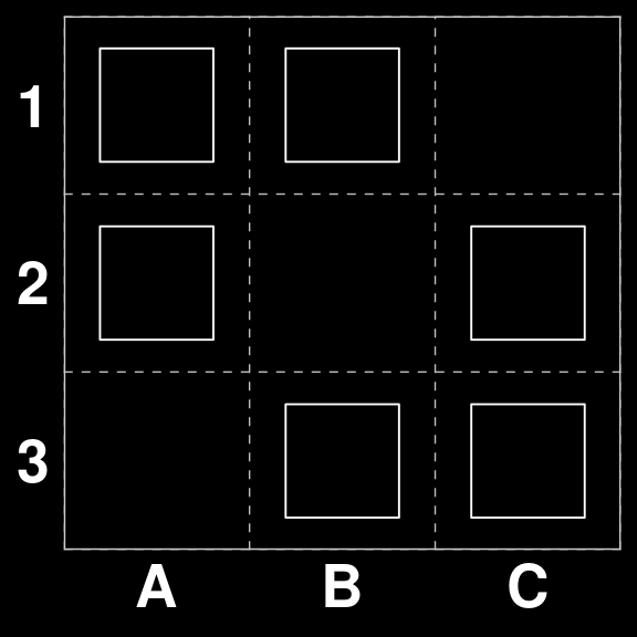 A |> paste(collapse = ", ") |> cat()A1 to B1, B1 to C1, A2 to B2, B2 to C2, A3 to B3, B3 to C3, A1 to A2, A2 to A3, B1 to B2, B2 to B3, C1 to C2, C2 to C3, Pass