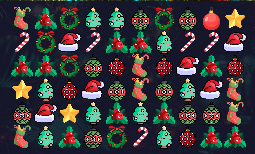 When starting the game a 6 by 10 grid with different shaped and colored tiles is displayed. These are Christmas-themed, i.e. trees, santas’ hats, candy and various Christmas ornaments. There is a total of ten different types of tiles. An example of a X-mas-3 board can be seen in Figure fig-xmas-screenshot-1.